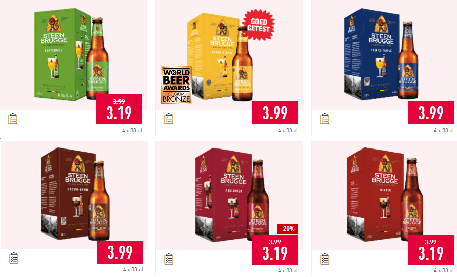 Het assortiment Aldi speciaal bieren bevat 6 speciale soorten bier. Allen van het een en hetzelfde merk namelijk Steenbrugge. De bieren rollen trouwens allemaal uit de brouwerij (fabriek) van Swinkels Family Brewers.